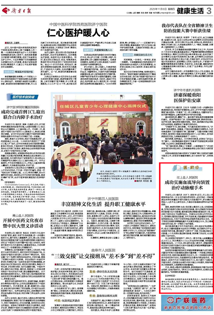 媒体看汶医 | 济宁日报:汶上县人民医院成功实施血流导向装置治疗动脉瘤手术