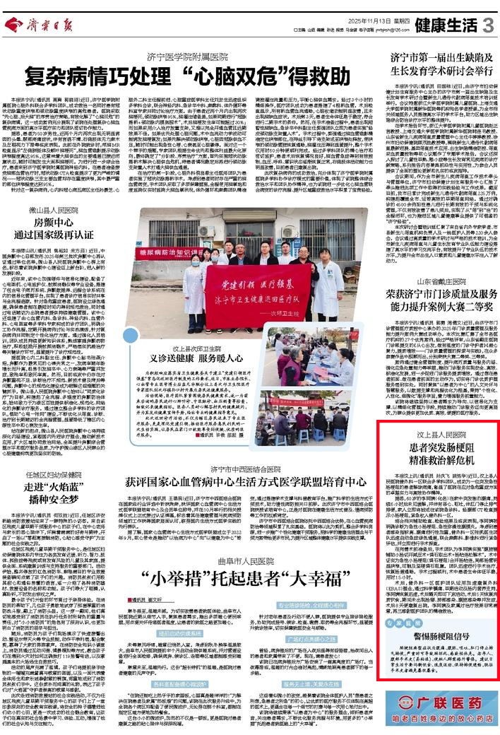 媒体看汶医 | 济宁日报:汶上县人民医院患者突发肠梗阻 精准救治解危机